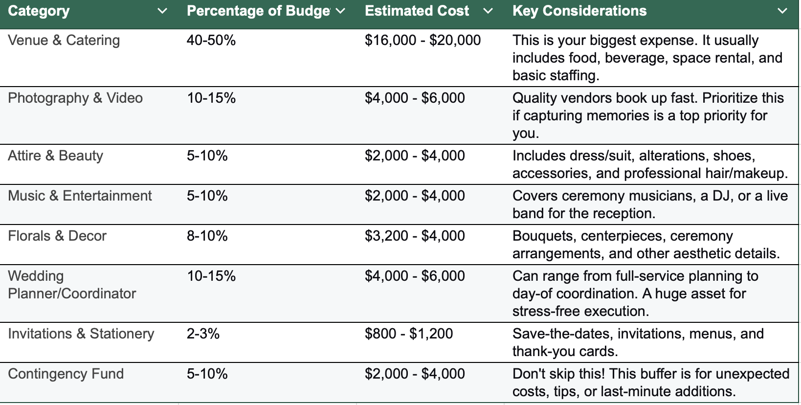Sample Wedding Budget Allocation for a $40,000 Arizona Wedding