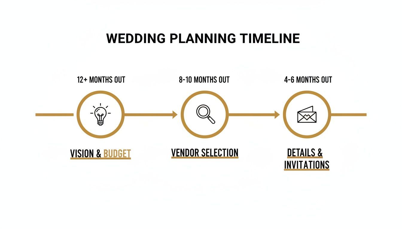 Planning a wedding essentially comes down to three big stages: figuring out your vision and budget, hiring your dream team of vendors, and then locking in all the final details. If you tackle them in that order, you’ll find the whole process moves from overwhelming to organized, letting you actually enjoy the journey to your wedding day.